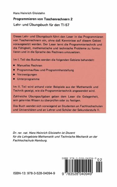 In den letzten Jahren haben die wissenschaftlichen Taschenrechner die bisherigen Rechen hilfsmittel (Rechenschieber, elektromechanische Tischrechner usw.) weitgehend abgelost_ Seit einiger Zeit befinden sich programmierbare Taschenrechner auf dem Markt, die wegen dervielfaltigen Einsatzmoglichkeiten und des gunstigen Preises ebenfalls rasch einen immer groBer werdenden Abnehmerkreis finden werden. Diese Gerate konnen noch mehr als die bisherigen den Benutzer von lastiger und langwieriger Rechenarbeit befreien. Dieses Buch wendet sich hauptsachlich an den im Programmieren unerfahrenen Leser, der seine ersten Kenntnisse auf diesem Gebiet mit einem programmierbaren Taschenrechner erwerben mochte. Wir denken dabei an die Studenten der ersten Semester naturwissen schaftlicher oder technischer Fachrichtung an Fachhochschulen oder Universitaten. Weiter an die Lehrer und Schuler der Studienstufe an Gymnasien. Der programmierbare Taschen· rechner entia stet ja nicht nur yom aufwendigen Rechnen, sondern er erzieht auch zum logischen Denken und genauen mathematischen Formulieren. SchlieBlich denken wir auch an diejenigen, die ohne Nutzanwendung sich einfach nur aus SpaB und Freude mit dem Programmieren eines Taschenrechners beschaftigen mochten.