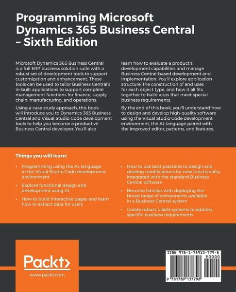 Explore the fundamentals of Dynamics 365 Business Central and the Visual Studio Code development environment with the help of useful examples and case studies Key Features:Tailor your applications to best suit the needs of your business Explore the latest features of Business Central with examples curated by industry experts Integrate Business Central features in your applications with this comprehensive guide Book Description: Microsoft Dynamics 365 Business Central is a full ERP business solution suite with a robust set of development tools to support customization and enhancement. These tools can be used to tailor Business Central's in-built applications to support complete management functions for finance, supply chain, manufacturing, and operations. Using a case study approach, this book will introduce you to Dynamics 365 Business Central and Visual Studio Code development tools to help you become a productive Business Central developer. You'll also learn how to evaluate a product's development capabilities and manage Business Central-based development and implementation. You'll explore application structure, the construction of and uses for each object type, and how it all fits together to build apps that meet special business requirements. By the end of this book, you'll understand how to design and develop high-quality software using the Visual Studio Code development environment, the AL language paired with the improved editor, patterns, and features. What You Will Learn:Programming using the AL language in the Visual Studio Code development environment Explore functional design and development using AL How to build interactive pages and learn how to extract data for users How to use best practices to design and develop modifications for new functionality integrated with the standard Business Central software Become familiar with deploying the broad range of components available in a Business Central system Create robust, viable systems to address specific business requirements Who this book is for: If you want to learn about Dynamics 365 Business Central's powerful and extensive built-in development capabilities, this is the book for you. ERP consultants and managers of Business Central development will also find this book helpful. Although you aren't expected to have worked with Dynamics Business Central, basic understanding of programming and familiarity with business application software will help you understand the concepts covered in this book.