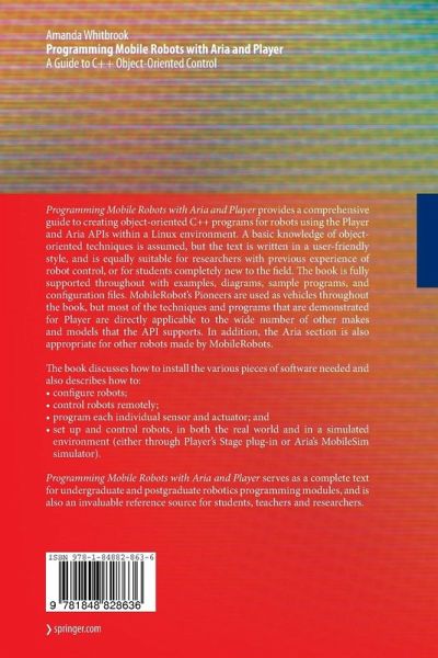"Programming Mobile Robots with Aria and Player" provides a guide to creating object-oriented C++ programs for robots using the Player and Aria APIs within a Linux environment. The book is supported throughout with examples, diagrams, sample programs, and configuration files. MobileRobot's Pioneers are used as vehicles throughout the book, but most of the techniques and programs that are demonstrated for Player are applicable to the other makes and models that the API supports. In addition, the Aria section is also appropriate for other robots made by MobileRobots.The book discusses how to install the various pieces of software needed and also describes how to: configure robots; control robots remotely; program each individual sensor and actuator; and set up and control robots."Programming Mobile Robots with Aria and Player" serves as a complete text for undergraduate and postgraduate robotics programming modules, and is also an invaluable reference source for students, teachers and researchers.Additional material for this book can be found at http://extras.springer.com.