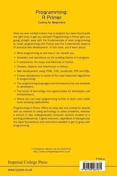 Have you ever wanted to learn how to program but never found quite the right book to get you started? Programming: A Primer gets you going straight away with the fundamentals of what programming is, basic programming with Python and the fundamental aspects of practical web development. In this book, you'll learn about: What programming is and how it can benefit you. Variables and operations as the building blocks of a program. If statements, For loops and Methods in Python. Classes, Objects and Inheritance in Python. Web development using HTML, CSS, JavaScript, PHP and SQL. A basic introduction to some of the most important algorithms in programming. The programming languages and frameworks that are available to developers. The future of technology and opportunities for developers and entrepreneurs. Where you can take programming further to learn and create more amazing applications. Programming: A Primer offers an easy way into coding for anyone with an interest in using technology to solve problems, whether a school or new undergraduate computer science student or a working professional. It gives everyone, regardless of background, the ideal foundations and motivation needed to get to grips with programming.