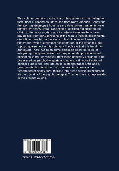 I. Behaviour Modification with Children.- Mannerisms, Mutilation and Management.- Acquisition of the Two-Word "Pivot-Open" Structure in Subnormal Children: A Case Study.- Comparison Among Therapists Attempting Language Training and Generalization of Punishment Effects in the Behaviour Modification of a Schizophrenic Child.- Treatment of Anorexia in Early Infancy - Some Behavioural Approaches.- Problems in the Conditioning Treatment of Enuresis.- II. Behavioural Approaches to Neurotic Disorders.- Are Phobics Jll?: Subject Sampling and the Validity of Treatment Analogues of Phobic Anxiety States.- Response Prevention and Modelling in the Treatment of Obsessive-Compulsive Neurosis: A Study of 24 Patients.- Three Flooding Procedures in the Treatment of Agoraphobics.- The Efficiency of a Standardized Assertive Training Program (ATP).- Behaviour Therapy and Bereavement.- Models of Depression.- III. Behaviour Treatment of Sexual Dysfunction.- The Masters and Johnson Approach to Marital Sexual Problems in a National Health Service Setting.- The Relevance of the Masters and Johnson Methodology to the Treatment of Sexual Disorders in an Outpatient.- Treatment of Frigidity by Group Desensitization.- Aversion Therapy with Sexual Deviants.- A Controlled Investigation of the Efficacy of Conjoint Marital Therapy: Interpretative Versus Directive.- Marital Interaction in Sexual Dysfunction.- IV. Approaches to Specific Behaviour Problems.- Systematic Desensitization and Self-Control Training in the Treatment of Speech Anxiety.- Therapy for Smoking.- Self-Control Techniques and Obesity.- The Effects of Monetary Rewards and Feedback on the Work Behaviour of Psychiatric Patients.- V. Some Physiological Aspects of Behaviour Modification.- The Relationship between Physiological andPsychophysiological Measures of Sexual Response.- Changes in Cardiac Rate Effected by Operant Reinforcement Contingencies.- Physiological Correlates of the Extinction of an Avoidance Response Under Three Conditions of Activation.- Clinical Observations Regarding the Use of Electromyographic Feedback with Chronically Anxious Patients.- VI. The Implementation of Behaviour Modification in the Environment.- Interaction Patterns in Clinical Behaviour Therapy.- The Application of the Principles of Behaviour Modification to Social Work Agencies in the South West Lancashire Area.- Behaviour Modification in a Therapeutic Community.- VII. Analysis and Evaluation of Behaviour Modification.- A Mathematical Model for the Analysis of Therapies.- Mathematical Models for Evaluation of Therapies.- An Approach to the Experimental Investigation of Some Parameters of Systematic Desensitization of the Individual Patient.- Discriminant Function Analysis of the SOM.- VIII. Methodological Problems in Behaviour Modification.- Behaviour is Behaviour is Behaviour.- Therapist Variables in the Desensitization of Clinically Phobic Patients.- An Evaluation of the Factors that Influence Prognosis in Behaviour Therapy.- Prognosis in Behavioural Psychotherapy.