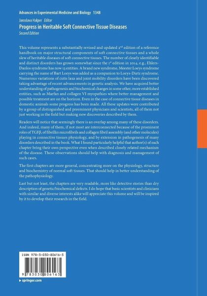 This volume represents a substantially revised and updated 2nd edition of a reference handbook on major structural components of soft connective tissues and a whole slew of heritable diseases of soft connective tissues. The number of clearly identifiable and distinct disorders has grown somewhat since the 1st edition in 2014, e.g., Ehlers-Danlos syndrome has now 13 entities. A brand new syndrome, Meester Loeys syndrome carrying the name of Bart Loeys was added as a companion to Loeys-Dietz syndrome. Numerous variations of cutis laxa and joint mobility disorders have been discovered taking advantage of recent advancements in genetic analysis. We have acquired better understanding of pathogenesis and biochemical changes in some other, more established entities, such as Marfan and collagen VI myopathies where better management and possible treatment are on the horizon. Even in the case of connective tissue diseases in domestic animals some progress has been made. All these updates werecontributed by a group of distinguished and preeminent physicians and scientists, all of them not just working in the field but making new discoveries described by them.