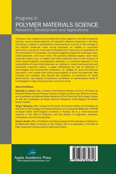 Gennady E. Zaikov, DSc, is head of the Polymer Division at the N. M. Emanuel Institute of Biochemical Physics, Russian Academy of Sciences, Moscow, and a professor at Moscow State Academy of Fine Chemical Technology, Russia, as well as a professor at Kazan National Research Technological University, Russia. He is also a prolific author, researcher, and lecturer. He has received several awards for his work, including the the Russian Federation Scholarship for Outstanding Scientists. He has been a member of many professional organizations and on the editorial boards of many international science journals. Oleg V. Stoyanov, DSc, is head of the Chair of Industrial Safety and professor of the Chair of Technology of Processing Plastic and Composite Materials (TPPCM) at Kazan State Technological University in Russia. He is a world-renowned scientist in the field of chemistry and the physics of oligomers, polymers, composites, and nanocomposites. Elena I. Kulish, DSc, is a professor and deputy head of the Laboratory of Semenov at Bashkirian State University in Ufa, Russia. She is a specialist in the field of high-molecular compounds and chemical kinetics.