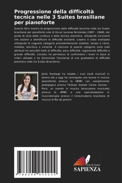 Questo libro mostra la progressione delle difficoltà tecniche nelle tre Suites brasiliane per pianoforte solo di Oscar Lorenzo Fernândez (1897 - 1948), dal punto di vista della scrittura e della tecnica pianistica, utilizzando strumenti che aiutano a identificare le difficoltà esistenti. L'opera è stata analizzata utilizzando le seguenti categorie precedentemente stabilite: tempo e ritmo, melodia, tessitura e sonorità. A ciascuna di queste categorie sono stati attribuiti tre possibili livelli di difficoltà: poca difficoltà, ragionevole difficoltà e grande difficoltà. L'analisi ha permesso di confrontare i brani in base ai criteri utilizzati e ha dimostrato l'esistenza di una gradazione di difficoltà pianistica nelle tre Suítes Brasileiras.