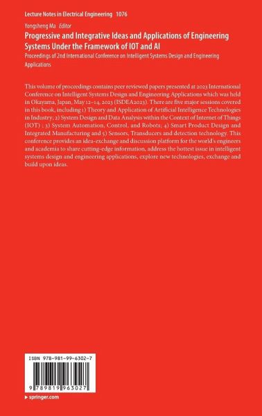 This volume of proceedings contains peer reviewed papers presented at 2023 International Conference on Intelligent Systems Design and Engineering Applications which was held in Okayama, Japan, May 12-14, 2023 (ISDEA2023). There are five major sessions covered in this book, including 1) Theory and Application of Artificial Intelligence Technologies in Industry; 2) System Design and Data Analysis within the Context of Internet of Things (IOT) ; 3) System Automation, Control, and Robots; 4) Smart Product Design and Integrated Manufacturing and 5) Sensors, Transducers and detection technology.…mehr