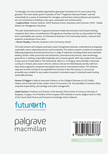 Preface.- Part I Introduction.- 1. What is Progressive Business? (Eleanor O'Higgins and Laszlo Zsolnai).- Part II Progressive Business Cases.-2. Banking on Values - Triodos Bank (Nel Hofstra and Luit Kloosterman).- 3. The Power of Tradition - Béres Pharmaceuticals (András Ócsai and Zsolt Boda).- 4. Coffee Making as Art - Illycafé (Antonio Tencati).- 5. Staff Inclusion - DKV Integralia (Marc Vilanova and Silvia Agulló).- 6. Economy for the Common Good - Sonnentor (Michael Muller-Camen and Jutta Camen).- 7. The Business of Recycling - Armor (Benedicte Faivre-Tavignot).- 8. Clean Energy - Lumituuli (Mikko Jalas and Jukka Mäkinen).- 9. The Ethos of Partnership - John Lewis Partnership (Eleanor O'Higgins).- 10. The Danish Model of Corporate Citizenship - The Novo Group (Jacob Dahl Rendtorff).- 11. Responsible Hospitality - Carlson Rezidor (Knut J. Ims and Kjell Grønhaug).-12. Sustainable Living - Unilever (Patrick E. Murphy and Caitlin E. Murphy).- Part III Conclusions.- 13. Future of Business (Eleanor O'Higgins and Laszlo Zsolnai).