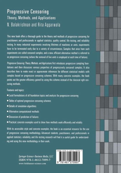 Censored sampling arises in a life-testing experiment whenever the experimenter does not observe (either intentionally or unintentionally) the failure times of all units placed on a life-test. Inference based on censored sampling has been studied during the past 50 years by numerous authors for a wide range of lifetime distributions such as normal, exponential, gamma, Rayleigh, Weibull, extreme value, log-normal, inverse Gaussian, logistic, Laplace, and Pareto. Naturally, there are many different forms of censoring that have been discussed in the literature. In this book, we consider a versatile scheme of censoring called progressive Type-II censoring. Under this scheme of censoring, from a total of n units placed on a life-test, only m are completely observed until failure. At the time of the first failure, Rl of the n - 1 surviving units are randomly withdrawn (or censored) from the life-testing experiment. At the time of the next failure, R2 of the n - 2 -Rl surviving units are censored, and so on. Finally, at the time of the m-th failure, all the remaining Rm = n - m -Rl - . . . - Rm-l surviving units are censored. Note that censoring takes place here progressively in m stages. Clearly, this scheme includes as special cases the complete sample situation (when m = nand Rl = . . . = Rm = 0) and the conventional Type-II right censoring situation (when Rl = . . . = Rm-l = 0 and Rm = n - m).