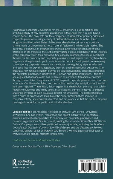 Progressive Corporate Governance for the 21st Century is a wide ranging and ambitious study of why corporate governance is the shape that it is, and how it can be better. The book sets out the emergence of shareholder primacy orientated corporate governance using a study of historical developments in the United Kingdom and the United States. Talbot sees shareholder primacy as a political choice made by governments, not a 'natural' feature of the inevitable market. She describes the periods of progressive corporate governance which governments promoted in the middle of the 20th century using a close examination of the theories of the company which then prevailed. She critically examines the rise of neoliberal theories on the company and corporate governance and argues that they have had a negative and regressive impact on social and economic development. In examining contemporary corporate governance she shows how regulatory styles as informed and described by prevailing regulatory theories, enables neoliberal outcomes. She illustrates how United Kingdom-derived corporate governance codes have informed the corporate governance initiatives of European and global institutions. From this she argues that neoliberalism has re-entered ex command transition economies through those United Kingdom and OECD inspired corporate governance Codes over a decade after the earlier failed and destructive neoliberal prescriptions for transition had been rejected.¿ Throughout, Talbot argues that shareholder primacy has socially regressive outcomes and firmly takes a stand against current initiatives to enhance shareholder¿ voting in such issues as director remuneration. The book concludes with a series of proposals to recalibrate the power between those involved in company activity; shareholders, directors and employees so that the public company can begin to work for the public and not shareholders.