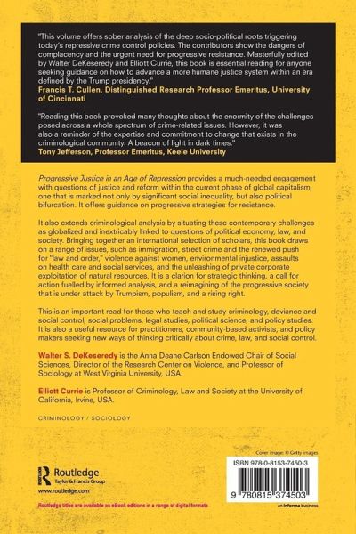 Introduction: responding to repression (Walter S. DeKeseredy) 1. By why this man?: challenging hegemonic masculinity in an age of repression ( Walter S. DeKeseredy) 2. Why the left must change: right-wing populism in context (Simon Winlow, Steve Hall and James Treadwell) 3. Social change and drugs: rural America and the Rise of Donald Trump (Joseph F. Donnermeyer) 4. Getting crime right: framing everyday violence in the age of Trump ( Elliott Currie) 5. The limits of police reform (Alex S. Vitale) 6. What would a just justice system look like? (Sandra Walklate) 7. Corporate criminality and resisting financial and securities frauds (Gregg Barak) 8. Beyond the ricochets: unpacking the modern gun culture and its political stalemate (Peter Squires) 9. Abortion politics and the persistence of patriarchy (Meda Chesney-Lind) 10. Resisting ecocide: engaging in the politics of the future (Rob White) 11. Youth for social justice in an age of youth expendability (Randy Myers and Tim Goddard) 12. What's wrong with American criminal justice reform? (Sonya Goshe) 13. Continuity of American xenophobia under Trump and plausible alternatives (James Diego Vigil and Nativo Lopez Vigil) Epilogue: pitfalls and possibilities (Elliott Currie)