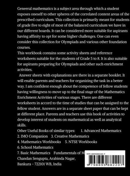 Geneeral mathematics is a subject area through which a student exposes oneself to other spheres of the correlated content areas of the curriculum. This collection is primarily meant for students of grade four of most of the balanced curriculum we have in our different boards. It can be considered more suitable for aspirants having affinity to opt for some higher challenges. One can even consider this collection for Olympiads and various other foundation courses. This workbook contains some activity sheets and reference worksheets suitable for the students of Grade 4. It is also suitable for aspirants preparing for Olympiads and other such enrichment activities. Answer sheets with explanations are there in a separate booklet. It will enable parents and teachers for organizing the task in a better way. I am confident enough about the competence of fellow students having willingness to move up to the final stage of the Mathematics Enrichment Activities of various stages. There are different worksheets in accord to the time of studies that can be assigned to the fellow student. Answers are in a separate sheet paper that can be kept at different place. Parents and teachers use this book of activities to develop interest of students on mathematical as well as analytical skills.
