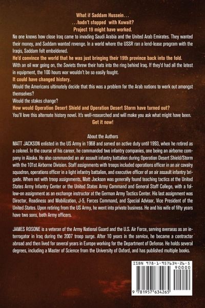 What if Saddam Hussein... ...hadn't stopped with Kuwait? Project 19 might have worked. No one knows how close Iraq came to invading Saudi Arabia and the United Arab Emirates. They wanted their money, and Saddam wanted revenge. In a world where the USSR ran a lend-lease program with the Iraqis, Saddam felt emboldened. He'd convince the world that he was just bringing their 19th province back into the fold. With an oil war going on, the Soviets threw their hats into the ring behind Iraq. If they'd had all the latest in equipment, the 100 hours war wouldn't be so easily fought. It could have changed history. Would the Americans ultimately decide that this was a problem for the Arab nations to work out amongst themselves? Would the stakes change? How would Operation Desert Shield and Operation Desert Storm have turned out? You'll love this alternate history novel. It's well-researched and will make you ask what might have been. Get it now!¿