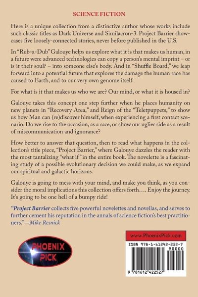"If you haven't read Galouye, Project Barrier is a fine place to start."-Mike Resnick Here is a unique collection from a distinctive author whose works include such classic titles as Dark Universe and Similacron-3. Project Barrier showcases five loosely-connected stories, never before published in the U.S. In "Rub-a-Dub" Galouye helps us explore what it is that makes us human, in a future were advanced technologies can copy a person's mental imprint - or is it their soul? - into someone else's body. And in "Shuffle Board," we leap forward into a potential future that explores the damage the human race has caused to Earth, and to our very own genome itself. For what is it that makes us who we are? Our mind, or what it is housed in? Galouye takes this concept one step further when he places humanity on new planets in "Recovery Area," and Reign of the "Teletpuppets," to show us how Man can (re)discover himself, when experiencing a first contact scenario. Do we rise to the occasion, as a race, or show our uglier side as a result of miscommunication and ignorance? How better to answer that question, then to read what happens in the collection's title piece, "Project Barrier," where Galouye dazzles the reader with the most tantalizing "what if" in the entire book. The novelette is a fascinating study of a possible evolutionary decision we could make, as we expand our spiritual and galactic horizons. Galouye is going to mess with your mind, and make you think, as you consider the moral implications this collection offers forth.... Enjoy the journey. It's going to be one hell of a bumpy ride! "Project Barrier collects five powerful novelettes and novellas, and serves to further cement his reputation in the annals of science fiction's best practitioners."-Mike Resnick