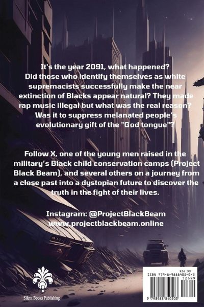 Introducing the gripping science fiction novel, "Project Black Beam" Step into the year 2091, a world shrouded in secrecy and plagued by hidden motives. In this dystopian future, a sinister plot unfolds. Those who identify as white supremacists manipulated events to bring about the near extinction of Blacks, But what truly lies beneath the surface of this harrowing reality? At the heart of this enthralling tale lies the question: Why was rap music outlawed? The authorities claim it was for societal stability, but was there a deeper motive? Could it have been an attempt to suppress the evolutionary power of the "God tongue" possessed by melanated people? As you embark on a tumultuous journey, you will follow X, a young man raised in the confines of the military's Black child conservation camps-codenamed Project Black Beam. Accompanied by a group of brave individuals, whose stories come from a not-so-distant past into a haunting future. Their lives hang in the balance as they navigate and unravel the mysteries that hold the key to their survival. "Project Black Beam" is a thought-provoking exploration of power, resilience, and the fight for justice in a world where the line between illusion and reality blurs. Delve deep into the intricate layers of this dystopian realm as the protagonists uncover and reveal hidden truths, challenge the system, and confront their own identities. Written with masterful storytelling and immersive prose, this captivating novel offers an enthralling blend of suspense, social commentary, and speculative fiction. Its pages will transport you to a future that feels disconcertingly tangible, evoking a range of emotions as you witness the characters' struggles, triumphs, and sacrifices. "Project Black Beam" is a gripping literary journey that will leave you questioning the nature of power, identity, and the consequences of silence. Prepare to be captivated by this powerful narrative that unveils the untold stories and brings to light the shadows that conceal the truth.