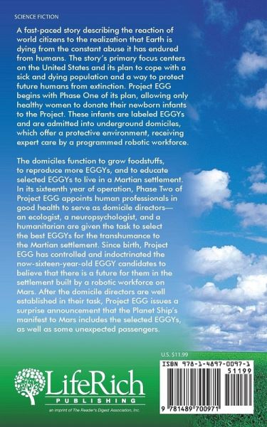 A fast-paced story describing the reaction of world citizens to the realization that Earth is dying from the constant abuse it has endured from humans. The story's primary focus centers on the United States and its plan to cope with a sick and dying population and a way to protect future humans from extinction. Project EGG begins with Phase One of its plan, allowing only healthy women to donate their newborn infants to the Project. These infants are labeled EGGYs and are admitted into underground domiciles, which offer a protective environment, receiving expert care by a programmed robotic workforce. The domiciles function to grow foodstuffs, to reproduce more EGGYs, and to educate selected EGGYs to live in a Martian settlement. In its sixteenth year of operation, Phase Two of Project EGG appoints human professionals in good health to serve as domicile directors-an ecologist, a neuropsychologist, and a humanitarian are given the task to select the best EGGYs for the transhumance to the Martian settlement. Since birth, Project EGG has controlled and indoctrinated the now-sixteen-year-old EGGY candidates to believe that there is a future for them in the settlement built by a robotic workforce on Mars. After the domicile directors are well established in their task, Project EGG issues a surprise announcement that the Planet Ship's manifest to Mars includes the selected EGGYs, as well as some unexpected passengers.