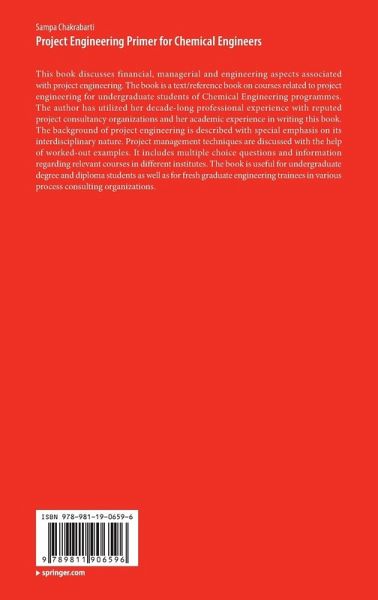 This book discusses financial, managerial and engineering aspects associated with project engineering. The book is a text/reference book on courses related to project engineering for undergraduate students of Chemical Engineering programmes. The author has utilized her decade-long professional experience with reputed project consultancy organizations and her academic experience in writing this book. The background of project engineering is described with special emphasis on its interdisciplinary nature. Project management techniques are discussed with the help of worked-out examples. It includes multiple choice questions and information regarding relevant courses in different institutes. The book is useful for undergraduate degree and diploma students as well as for fresh graduate engineering trainees in various process consulting organizations.