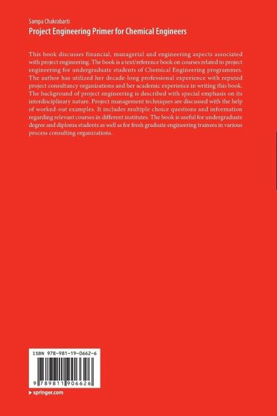 This book discusses financial, managerial and engineering aspects associated with project engineering. The book is a text/reference book on courses related to project engineering for undergraduate students of Chemical Engineering programmes. The author has utilized her decade-long professional experience with reputed project consultancy organizations and her academic experience in writing this book. The background of project engineering is described with special emphasis on its interdisciplinary nature. Project management techniques are discussed with the help of worked-out examples. It includes multiple choice questions and information regarding relevant courses in different institutes. The book is useful for undergraduate degree and diploma students as well as for fresh graduate engineering trainees in various process consulting organizations.