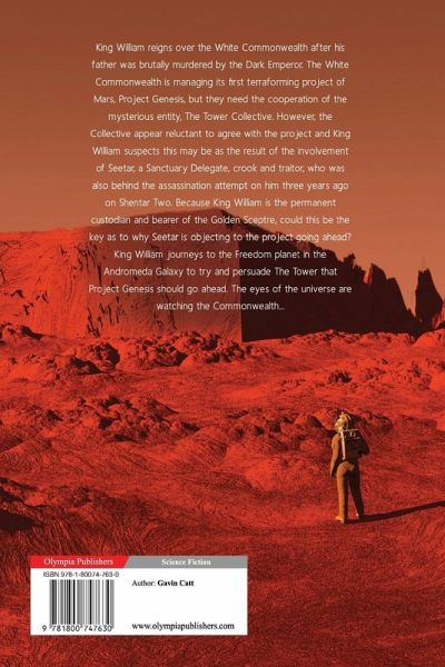 King William reigns over the White Commonwealth after his father was brutally murdered by the Dark Emperor. The White Commonwealth is managing its first terraforming project of Mars, Project Genesis, but they need the cooperation of the mysterious entity, The Tower Collective. However, the Collective appear reluctant to agree with the project and King William suspects this may be as the result of the involvement of Seetar, a Sanctuary Delegate, crook and traitor, who was also behind the assassination attempt on him three years ago on Shentar Two. Because King William is the permanent custodian and bearer of the Golden Sceptre, could this be the key as to why Seetar is objecting to the project going ahead? King William journeys to the Freedom planet in the Andromeda Galaxy to try and persuade The Tower that Project Genesis should go ahead. The eyes of the universe are watching the Commonwealth...