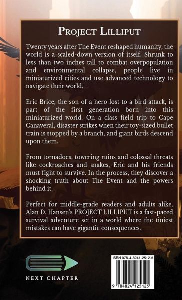Twenty years after The Event reshaped humanity, the world is a scaled-down version of itself. Shrunk to less than two inches tall to combat overpopulation and environmental collapse, people live in miniaturized cities and use advanced technology to navigate their world. Eric Brice, the son of a hero lost to a bird attack, is part of the first generation born into this miniaturized world. On a class field trip to Cape Canaveral, disaster strikes when their toy-sized bullet train is stopped by a branch, and giant birds descend upon them. From tornadoes, towering ruins and colossal threats like cockroaches and snakes, Eric and his friends must fight to survive. In the process, they discover a shocking truth about The Event and the powers behind it. Perfect for middle-grade readers and adults alike, Alan D. Hansen's PROJECT LILLIPUT is a fast-paced survival adventure set in a world where the tiniest mistakes can have gigantic consequences.