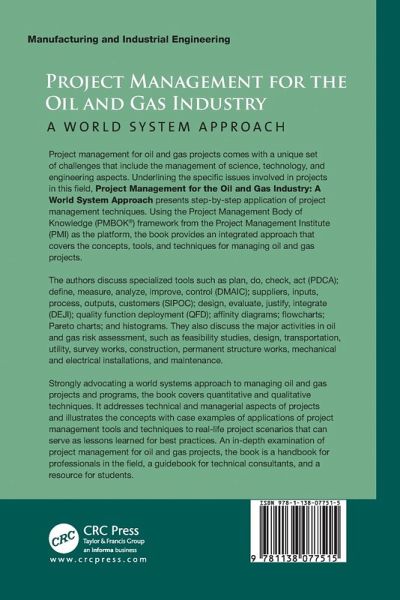 This book presents an integrated approach to project management for oil and gas projects. It covers concepts, tools, and techniques of project management based on the elements of the Project Management Body of Knowledge. The book also contains case examples of applications of project management tools and techniques to real-life project scenarios. The book is intended to serve as a reference book for planners, project operators, stakeholders, designers, project managers, business managers, consultants, project analysts, senior executives, project team members, members of project management office, project customers, functional managers, trainers, and researchers.