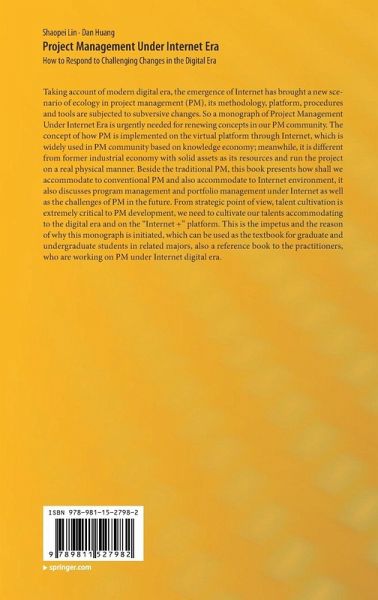 Taking account of modern digital era, the emergence of Internet has brought a new scenario of ecology in project management (PM), its methodology, platform, procedures and tools are subjected to subversive changes. So a monograph of Project Management Under Internet Era is urgently needed for renewing concepts in our PM community. The concept of how PM is implemented on the virtual platform through Internet, which is widely used in PM community based on knowledge economy; meanwhile, it is different from former industrial economy with solid assets as its resources and run the project on a real physical manner. Beside the traditional PM, this book presents how shall we accommodate to conventional PM and also accommodate to Internet environment, it also discusses program management and portfolio management under Internet as well as the challenges of PM in the future. From strategic point of view, talent cultivation is extremely critical to PM development we need to cultivate our talents accommodating to the digital era and on the "Internet +" platform. This is the impetus and the reason of why this monograph is initiated, which can be used as the textbook for graduate and undergraduate students in related majors, also a reference book to the practitioners, who are working on PM under Internet digital era.