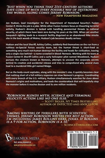 Jon Hudson, lead investigator for the Department of Homeland Security's Fusion Center-P, thinks his job is a joke. While other Fusion Centers focus on thwarting terrorist activity, Hudson's division is tasked with handling paranormal threats to national security, of which there have been zero during his years at the DHS. When yet another Sasquatch sighting leads to a research facility disguised as an abandoned Nike missile site in the back woods of Maine, Hudson's job becomes deadly serious. Hudson and the local Sherriff, Ashley Collins, suddenly find themselves on the run from a ruthless ex-Special Forces security team, but the human threat is short-lived as something very much not-human destroys the facility and heads for civilization, leaving only a single clue behind--a name scrawled in blood: Nemesis. Working with his team at Fusion Center-P, Sherriff Collins and a surly helicopter pilot named Woodstock, Hudson pursues the creature known as Nemesis, attempts to uncover the corporate secrets behind its creation and accidental release and tries to comprehend why several clues lead to a murdered little girl named Maigo. But as the body-count explodes, along with the monster's size, it quickly becomes clear that nothing short of a full military response can slow Nemesis's progress. Coordinating with every branch of the U.S. military, Hudson simultaneously searches for clues about Nemesis's origins and motivations, and leads the counterattack that will hopefully stop the monster before it reaches Boston and its one million residents. Witness the birth of a legend as Jeremy Robinson, bestselling author of SecondWorld and Ragnarok, combines the pacing of Matthew Reilly with the mystery of James Rollins and creates the first iconic American Kaiju* story since King Kong. Includes original creature designs by legendary Godzilla artist, Matt Frank. *Kaiju is Japanese for "strange beast." The genre includes classic monsters such as Godzilla, Gamera, Mothra, Rodan and King Ghidorah.
