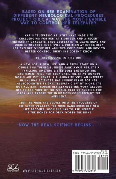 Based on her examination of different neurological procedures, Project O.R.C.A. was the most feasible way to control her telepathy. Kari's telepathic abilities have made life challenging for her. At eighteen and a recent university graduate, she's desperate to leave home and work in neuroscience. Will a position at inCog help her explore where her abilities come from and how to better control them? She doesn't know. But she's going to find out. A new job, a new life, and a fresh start on a cruise ship turned business park await her. It's a thrilling time. But little does she know the excitement will not stop until the ship's owner's goals are met. Henry, a billionaire with an interest in unusual sciences, has unique plans for her. Neuroscientist by day, telepathic spy by night. It's not all bad, though; her clandestine work allows her to see more of the world, receive funding for ORCA, and expose the injustices committed by the affluent. But the more she delves into the thoughts of the super wealthy, the more dangerous her new life becomes. Soon she has to ask herself, is the money for ORCA worth the risk? "Now the real science begins . . ."
