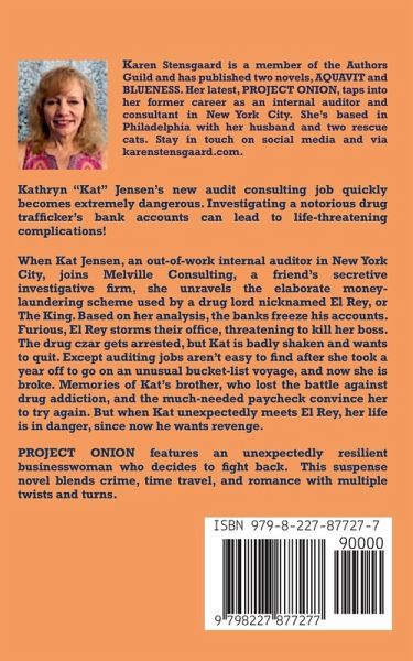 Kathryn "Kat" Jensen's new audit consulting job quickly becomes extremely dangerous. Investigating a notorious drug trafficker's bank accounts can lead to life-threatening complications! When Kat Jensen, an out-of-work internal auditor in New York City, joins Melville Consulting, a friend's secretive investigative firm, she unravels the elaborate money-laundering scheme used by a drug lord nicknamed El Rey, or The King. Based on her analysis, the banks freeze his accounts. Furious, El Rey storms their office, threatening to kill her boss. The drug czar gets arrested, but Kat is badly shaken and wants to quit. Except auditing jobs aren't easy to find after she took a year off to go on an unusual bucket-list voyage, and now she is broke. Memories of Kat's brother, who lost the battle against drug addiction, and the much-needed paycheck convince her to try again. But when Kat unexpectedly meets El Rey, her life is in danger, since now he wants revenge. PROJECT ONION features an unexpectedly resilient businesswoman who decides to fight back. This suspense novel blends crime, time travel, and romance with multiple twists and turns. What book reviewers are saying: "Following the typical format of crime fiction, Stensgaard delivers an entertaining set-up to her series. Kat's motivations for joining the Melville Consulting team are clear and her emotions are apparent and relatable." - The BookLife Prize, part of Publishers Weekly "Project Onion by Karen Stensgaard is an engrossing read, packed with suspense, a little romance, and even some time travel for good measure. It has a very strong female lead, plenty of action, and no small amount of stunning twists and turns that will leave you dizzy. The main character is the kind of woman that others might dream of being - a sophisticated, smart decision-maker who isn't afraid to stare danger in the face and the thrilling plot marks the start of what looks to be a great new series. I thoroughly enjoyed reading this and am looking forward to more of Kat Jenson's adventures." - 5 Star Review by Anne-Marie Reynolds for Readers' Favorite "A riveting, impossible-to-put-down novel... Stensgaard kicks start her The Melville Consulting Series with this very clever, unpredictable genre mash-up tale. Stensgaard's shrewd observations about a woman struggling to gather her courage in the face of unexpectedly trying circumstances register beautifully. The pacing is fast and tension stays high with relentless suspense in the back. This action-packed time-travel thriller delivers on its promising concept." - The Prairies Book Review "An incredible story from a great storyteller with realistic and elaborately developed characters, Project Onion is a spellbinding opening that will create a lot of anticipation in readers as they wait for the next installment in the series. The narrative is enriched by the beautiful prose and Karen Stensgaard's deft creation in setting and atmosphere." - 5 Star Review by Romuald Dzemo for Readers' Favorite "This book is one of a kind ... The drama and romance set among the mystery make it an even more intriguing read and keeps you hooked and invested in the plot. I would love to read more such work or even more about these same characters. Kudos to the author for coming up with this story, and I hope the upcoming ones are just as great!" - 5 Star Review from Instagram Book Blogger read.with.emilee