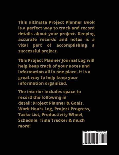 This Project Planner is a perfect way that you can keep track of all your projects. It will help your get organized with all your projects whether it's at the office with work & business projects or at home with knitting, sewing, crochet projects or any other tasks all in one place. The interior contains space for: Monthly Planner & Goals Page - List your goals & top priorities for the month. Project Planner & Goals - List your project name, start date, deadline, information & action plan, tools & resources. Project to do list, ideas, concepts & action plan overview. Work Hours Log - Task details, date & hours worked. Project Progress - Track your progress. Project Tasks List - Action steps for tasks, due date & tick box for completion. Productivity Planner - Daily goals & priorities, main task, secondary task, other tasks. Weekly Planner - Weekly overview of your tasks planned plus notes section. Productivity Wheel - Color chart to track productivity. Weekly Schedule - Hour by hour for the week schedule. Project Time Tracker - 15 minute tracker to check as completed. Project Manager - 5 week goal tracker. Month In Review - Summarize your month with reflection, highlights, improve & focus. Daily Goal Tracker - Track the progress of your goals. Daily Schedule & Priorities - Hour by hour schedule, reminders, today's to do list, notes. This Project Management log book is a great way to get organized your projects & record your progress. If you need to organize your projects, this is a great tool to use. Easy to use every day or whenever you like. Also will make a great gift. Size is 8.5x11 inches, 154 pages, elegant design, quality white paper, soft matte finish cover, paperback.
