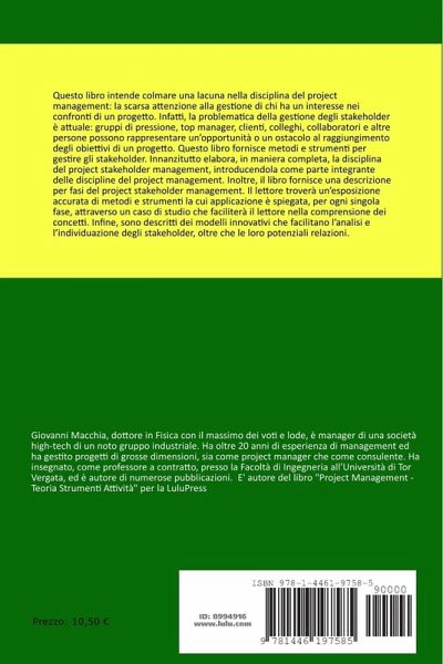 Questo libro intende colmare una lacuna nella disciplina del project management: la scarsa attenzione alla gestione di chi ha un interesse nei confronti di un progetto. La problematica della gestione degli stakeholder è attuale: gruppi di pressione, top manager, clienti, colleghi, collaboratori e altre persone possono rappresentare un'opportunità o un ostacolo al progetto. Questo libro fornisce metodi e strumenti per gestire gli stakeholder. Elabora, in maniera completa, la disciplina del project stakeholder. Inoltre, il libro fornisce una descrizione per fasi del project stakeholder management. Il lettore troverà un'esposizione accurata di metodi e strumenti la cui applicazione è spiegata, per ogni singola fase, attraverso un caso di studio che faciliterà il lettore nella comprensione dei concetti. Infine, sono descritti dei modelli innovativi che facilitano l'analisi e l'individuazione degli stakeholder, oltre che le loro potenziali relazioni.