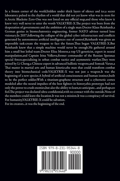 In a frozen corner of the world,hidden under thick layers of silence and ice,a secret laboratory pulsed to the rhythm of a world that did not yet know what was in store for it.Arctic Blacksite Zero-One was not listed on any official map,and those who knew it knew very well never to utter the words VALKYRIE-X. The project was born from the desperation of governments and the ambition of a single man:Doctor Klaus Reinhardt,a German genius in biomechatronics engineering, former NATO advisor turned lone visionary.In 2037,following the collapse of the global cyber infrastructure and conflicts generated by autonomous artificial intelligences out of control,Reinhardt was given an impossible task:create the weapon to face the future.Thus began VALKYRIE-X.But Reinhardt knew that a simple machine would never be enough.He gathered around him a small but lethal team:Doctor Eliza Monroe,a top US geneticist,expert in neural manipulation,and Captain Irina Volkova,former commander of the Russian Spetsnaz special forces,specializing in urban combat tactics and asymmetric warfare.They were joined by Li Cheng,a Chinese expert in advanced ballistic weapons,and Somsak Varun,a Thai master in martial arts and human kinetics,the man that could transform combat theory into biomechanical code.VALKYRIE-X was not just a weapon.It was the beginning of a new species.A hybrid of artificial consciousness and human instinct,built to be the perfect soldier.With a titanium-graphene structure and a cybernetic cortex modeled after the neural impulses of the best fighters in history,this prototype had not only the power to crush enemies,but also the ability to learn,to anticipate...and perhaps,to feel.The project was declared ultra-confidential,with no contact with the outside.None of the members could leave the location.It was not a mission.It was a conspiracy of survival. For humanity,VALKYRIE-X could be salvation. For its creators...it was the beginning of the end.
