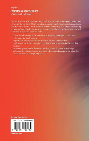 This book covers ALL aspects of projected capacitive touch sensors including basic principles, the physics of PCAP, capacitance measurements, touch sensor materials and construction, electrical noise, software drivers, and testing. It is targeted at working engineers who are implementing touch into their products as well as anyone else with an interest in how touch screens work.