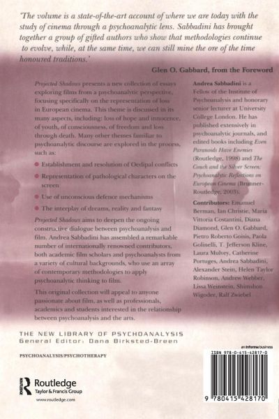 Gabbard Foreword. Sabbadini Introduction. Kline The Night of Melancholia and the Daylight of Mourning: Anne Fontaine's Comment j'ai tué mon père. Goisis Quest for a Lost Mother: Alina Marazzi's Un'ora sola ti vorrei. Wigoder Berman Is There Light at the End of the Tunnel? Keren Yedaya's Or (Mon Tresor). Costantini Golinelli The Anorexic Paradox: Matteo Garrone's First Love. Zwiebel Reparation and the Empathic Other: Christian Petzold's Wolfsburg. Sabbadini The Talking Cure from Freud to Almodóvar: Hable con ella. Portuges Intergenerational Transmission: The Holocaust in Central European Cinema. Webber Cut and Laced: Traumatism and Fetishism in Luis Buñuel's Un Chien Andalou. Taylor Robinson Two Short Films by Jan Svankmajer: Jabberwocky and Punch and Judy. Mulvey Compilation Film as 'Deferred Action': Vincent Monnikendam's Mother Dao the Turtle-like. Weinstein Moving Beyond the Constraints of the Mortal Self: Universal Images of Narcissism in Jan Troell's The Flight of the Eagle. Stein Tricycles Bicycles Life Cycles: Psychoanalytic Perspectives on Childhood Loss and Transgenerational Parenting in Sylvain Chômet's Belleville Rendez-Vous. Diamond Loss Mourning and Desire in Midlife: François Ozon's Under the Sand and Swimming Pool. Sabbadini Three Sisters: Sibling Knots in Bergman's Cries and Whispers. Christie Time Regained: The Complex Magic of Reverse Motion. Films Index.