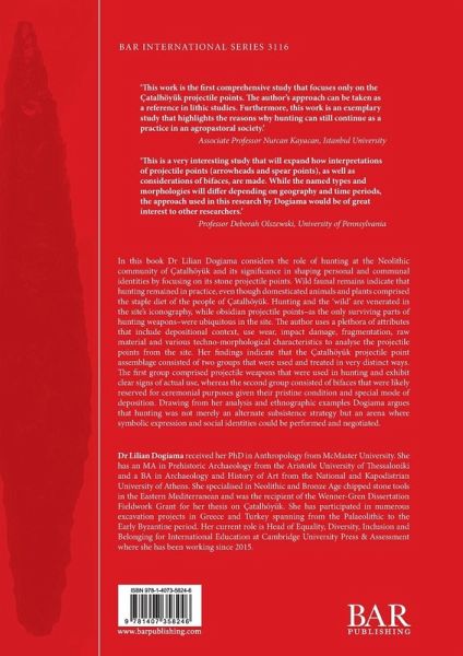 In this book Dr Lilian Dogiama considers the role of hunting at the Neolithic community of Çatalhöyük and its significance in shaping personal and communal identities by focusing on its stone projectile points. Wild faunal remains indicate that hunting remained in practice, even though domesticated animals and plants comprised the staple diet of the people of Çatalhöyük. Hunting and the 'wild' are venerated in the site's iconography, while obsidian projectile points -as the only surviving parts of hunting weapons- were ubiquitous in the site. The author uses a plethora of attributes that include depositional context, use wear, impact damage, fragmentation, raw material and various techno-morphological characteristics to analyse the projectile points from the site. Her findings indicate that the Çatalhöyük projectile point assemblage consisted of two groups that were used and treated in very distinct ways. The first group comprised projectile weapons that were used in hunting and exhibit clear signs of actual use, whereas the second group consisted of bifaces that were likely reserved for ceremonial purposes given their pristine condition and special mode of deposition. Drawing from her analysis and ethnographic examples Dogiama argues that hunting was not merely an alternate subsistence strategy but an arena where symbolic expression and social identities could be performed and negotiated.