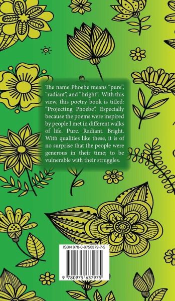The name Phoebe means "pure", "radiant", and "bright". With this view, this poetry book is titled: "Projecting Phoebe". Especially because the poems were inspired by people I met from different walks of life. Pure. Radiant. Bright. With qualities like these, it is of no surprise that the people were generous in their time to be vulnerable with their struggles. Confirming their intention: to live as a testament of belonging to God. Sublime.