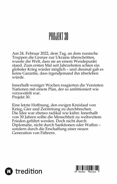 Am 24. Februar 2022, dem Tag, an dem russische Truppen die Grenze zur Ukraine überschritten, wusste die Welt, dass sie an einem Wendepunkt stand. Zum ersten Mal seit Jahrzehnten schien ein globaler Krieg wieder möglich - und diesmal gab es keine Garantie, dass irgendjemand ihn überleben würde.Innerhalb weniger Wochen reagierten die Vereinten Nationen mit einem Plan, der so ambitioniert wie verzweifelt war.Projekt 30.Eine letzte Hoffnung, den ewigen Kreislauf von Krieg, Gier und Zerstörung zu durchbrechen.Die Idee war ebenso radikal wie kühn: Innerhalb von 30 Jahren sollte die Menschheit zu weltweitem Frieden geführt werden. Doch nicht durch Diplomatie, nicht durch Sanktionen oder Waffen - sondern durch die Erschaffung einer neuen Generation von Führern.