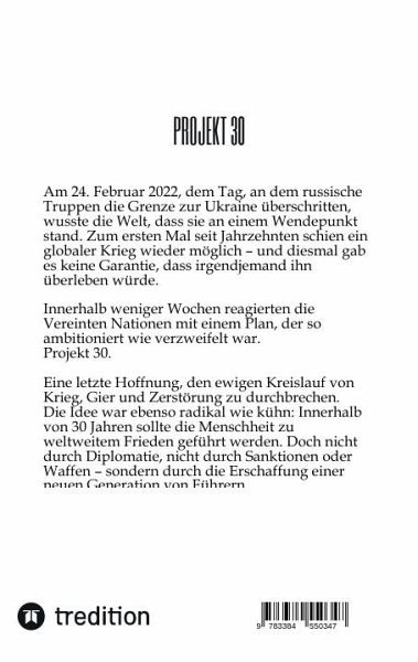 Am 24. Februar 2022, dem Tag, an dem russische Truppen die Grenze zur Ukraine überschritten, wusste die Welt, dass sie an einem Wendepunkt stand. Zum ersten Mal seit Jahrzehnten schien ein globaler Krieg wieder möglich - und diesmal gab es keine Garantie, dass irgendjemand ihn überleben würde.Innerhalb weniger Wochen reagierten die Vereinten Nationen mit einem Plan, der so ambitioniert wie verzweifelt war.Projekt 30.Eine letzte Hoffnung, den ewigen Kreislauf von Krieg, Gier und Zerstörung zu durchbrechen.Die Idee war ebenso radikal wie kühn: Innerhalb von 30 Jahren sollte die Menschheit zu weltweitem Frieden geführt werden. Doch nicht durch Diplomatie, nicht durch Sanktionen oder Waffen - sondern durch die Erschaffung einer neuen Generation von Führern.