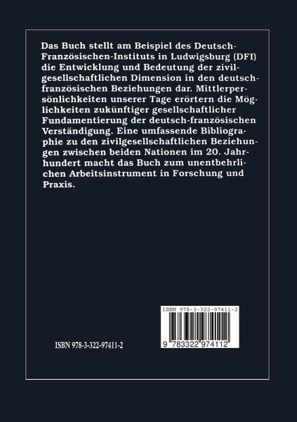 I Das Deutsch-Französische Institut in der Geschichte des zivilgesellschaftlichen Austauschs zwischen Deutschland und Frankreich.- 1. Zivilgesellschaft und transnationale Politik.- 2. Die Anfange zivilgesellschaftlichen Austauschs zwischen Deutschland und Frankreich.- 3. Die Gründung des "Deutsch-Französischen Instituts" in Ludwigsburg.- 4. Das DR im Netzwerk deutsch-französischer Organisationen und Institutionen von 1963 bis 1989.- II Dokumentierende Darstellungen.- a Die Gründung des Deutsch-Französischen Instituts.- Antrag auf Gründung eines deutsch-französischen Instituts (1948).- Deutschland und Frankreich. Vortrag anläßlich der Institutseröffnung (1949).- Nachbetrachtungen zur Institutseröffnung (1949).- Verständigungsbemühungen. Ein Kommentar zur Institutseröffnung (1949).- Begegnungen und Austausch (1949).- Über Ziele und Arbeit des Deutsch-Französischen Instituts (1954).- Die "Kulturmauer" durchbrechen. Kulturelle Dimensionen politischer und wirtschaftlicher Zusammenarbeit in Europa (1987).- Ludwigsburger Wahlverwandtschaften (1997).- Erinnerungen an die Gründung des Deutsch-Französischen Instituts (1997).- Damals und heute: immer noch wegweisend? (1997).- b Die Entwicklung des Deutsch-Französischen Instituts.- Etappen der Institutsentwicklung.- Forschungs- bzw. Publikationsprojekte und Forschungsvernetzung des Deutsch-Französischen Instituts.- Nachwuchsförderung und Informationsverbesserung. Die Studenten- und Journalistenseminare des Deutsch-Französischen Instituts.- Konferenzen, Expertengespräche und Vorträge im Deutsch-Französischen Institut.- Die Deutsche Frankreich-Bibliothek. Informationsaufgaben am Deutsch-Französischen Institut im Wandel.- Annex I: Ausgewählte Veröffentlichungen des DFI und über das DR.- IIIPerspektiven: Bilaterale Verständigung zwischen Deutschland und Frankreich im Zeichen von Europäisierung, Internationalisierung und Globalisierung am Ende des 20. Jahrhunderts.- 1. Stellungnahmen von Mittlerpersönlichkeiten 1927/28.- 2. Stellungnahmen von Mittlerpersönlichkeiten 1997/98.- Austausch als Abenteuer des Alltags.- Das Dach der Zivilität. Die gemeinsame Vision und Aufgabe Deutschlands und Frankreichs.- Neue Formen der Kulturvermittlung erfinden.- Von der deutsch-französischen Versöhnung zur gemeinsamen Zukunftsbewältigung.- Die deutsch-französischen Beziehungen vor dem qualitativen Sprung.- Gewöhnungseffekte und die Entdeckung der Gegenwart.- Für eine Vertiefung des deutsch-französischen Dialogs.- Deutsch-französische Beziehungen: Jede Generation neu für sich.- Deutsche Globalromanistik und die Hürden der literaturwissenschaftlichen Kooperation.- Die Zeit des Vergessens ist vorüber.- Bikulturelle Ausbildung als Sockel für internationale Karrieren.- Strukturprobleme im deutsch-französischen gesellschaftlichen Austausch.- Französisch-deutsche Beziehungen heute: Mythos und Möglichkeiten der Kooperation.- Die deutsch-französische Verständigung muß umkehren, will sie voranschreiten.- Austausch muß in Kooperation münden.- Jenseits des politischen Aktivismus: für eine deutsch-französische Bürgergesellschaft.- Problemfelder in der kulturellen Dimension der deutsch-französischen Beziehungen.- Über deutsche und französische Hochschulen. Ein erfundenes Gespräch.- Deutsch-französische Beziehungen nach 1989.- Vom Sonderweg zur Freundschaft mit Frankreich.- Deutschland - Frankreich. 1928 bis 1997.- Deutschland und Frankreich.- Zivile Strukturen des deutsch-französischen Austauschs.- Für die zunehmende Aktivierung desdeutsch-französischen Dialogs!.- Die Zukunft gehört neuen Aufgaben.- Wider die Miß-Verständigung.- Zu neuen Ufern - mit alten Erfahrungen.- Um ein künftiges europäisches Gesellschaftsmodell streiten.- 3. Deutsch-Französisches Institut.- Zukunft gestalten. Neue Herausforderungen für den deutsch-französischen Dialog.- IV Bibliographischer Versuch zu den zivilgesellschaftlichen Beziehungen zwischen Deutschland und Frankreich im 20. Jahrhundert.- 1. Gesellschaftsbeziehungen.- 2. Kulturbeziehungen.- 3. Wirtschaftsbeziehungen.- Zu den Autoren dieses Buches.- Personenregister.