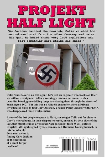 Colin Studebaker is no FBI agent; he's just an engineer who works on their surveillance equipment. After a seemingly random encounter with a beautiful blond, he finds that gun-wielding thugs are chasing them through the streets of Washington D.C. But this was no random encounter. She's a Private Investigator hired to find Gary Jackson, a Senior Policy Advisor with FEMA who disappeared three weeks earlier. As one of the last people to speak to Gary, she sought Colin out for clues to Gary's whereabouts. In their desperate search, pursued by both sides of the law, they stumble upon a yellowed Nazi document from WWII entitled Projekt Half Light, signed by Reichsmarschall Hermann Göring himself. Is this decades old document a clue to finding Gary Jackson or the beginning of a much larger problem?