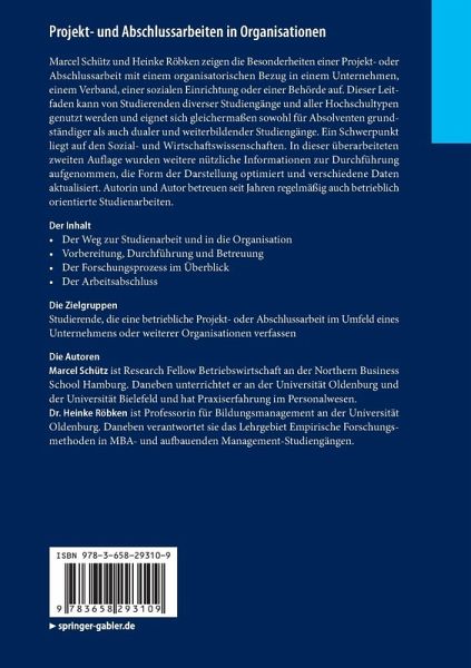 Marcel Schütz und Heinke Röbken zeigen die Besonderheiten einer Projekt- oder Abschlussarbeit mit einem organisatorischen Bezug in einem Unternehmen, einem Verband, einer sozialen Einrichtung oder einer Behörde auf. Dieser Leitfaden kann von Studierenden diverser Studiengänge und aller Hochschultypen genutzt werden und eignet sich gleichermaßen sowohl für Absolventen grundständiger als auch dualer und weiterbildender Studiengänge. Ein Schwerpunkt liegt auf den Sozial- und Wirtschaftswissenschaften. In dieser überarbeiteten zweiten Auflage wurden weitere nützliche Informationen zur Durchführung aufgenommen, die Form der Darstellung optimiert und verschiedene Daten aktualisiert. Autorin und Autor betreuen seit Jahren regelmäßig auch betrieblich orientierte Studienarbeiten.