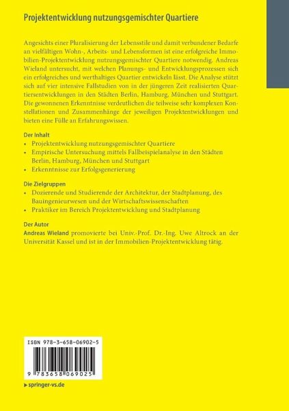 Angesichts einer Pluralisierung der Lebensstile und damit verbundener Bedarfe an vielfältigen Wohn-, Arbeits- und Lebensformen ist eine erfolgreiche Immobilien-Projektentwicklung nutzungsgemischter Quartiere notwendig. Andreas Wieland untersucht, mit welchen Planungs- und Entwicklungsprozessen sich ein erfolgreiches und werthaltiges Quartier entwickeln lässt. Die Analyse stützt sich auf vier intensive Fallstudien von in der jüngeren Zeit realisierten Quartiersentwicklungen in den Städten Berlin, Hamburg, München und Stuttgart. Die gewonnenen Erkenntnisse verdeutlichen die teilweise sehr komplexen Konstellationen und Zusammenhänge der jeweiligen Projektentwicklungen und bieten eine Fülle an Erfahrungswissen.
