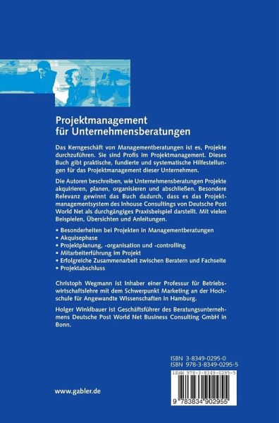 Die Autoren beschreiben, wie Unternehmensberatungen Projekte akquirieren, planen, organisieren und abschließen. Besondere Relevanz gewinnt das Buch dadurch, dass es das Projektmanagementsystem der Inhouse Consulting Deutsche Post als durchgängiges Praxisbeispiel darstellt. Mit vielen Beispielen, Übersichten und Anleitungen.