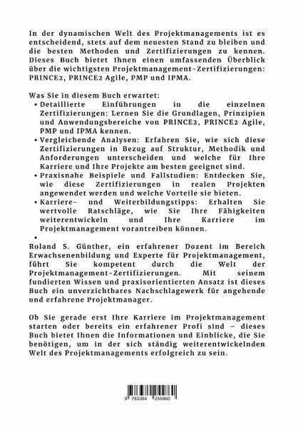 In der dynamischen Welt des Projektmanagements ist es entscheidend, stets auf dem neuesten Stand zu bleiben und die besten Methoden und Zertifizierungen zu kennen. Dieses Buch bietet Ihnen einen umfassenden Überblick über die wichtigsten Projektmanagement-Zertifizierungen: PRINCE2, PRINCE2 Agile, PMP und IPMA.Was Sie in diesem Buch erwartet:- Detaillierte Einführungen in die einzelnen Zertifizierungen: Lernen Sie die Grundlagen, Prinzipien und Anwendungsbereiche von PRINCE2, PRINCE2 Agile, PMP und IPMA kennen.- Vergleichende Analysen: Erfahren Sie, wie sich diese Zertifizierungen in Bezug auf Struktur, Methodik und Anforderungen unterscheiden und welche für Ihre Karriere und Ihre Projekte am besten geeignet sind.- Praxisnahe Beispiele und Fallstudien: Entdecken Sie, wie diese Zertifizierungen in realen Projekten angewendet werden und welche Vorteile sie bieten.- Karriere- und Weiterbildungstipps: Erhalten Sie wertvolle Ratschläge, wie Sie Ihre Fähigkeiten weiterentwickeln und Ihre Karriere im Projektmanagement vorantreiben können.Roland S. Günther, ein erfahrener Dozent im Bereich Erwachsenenbildung und Experte für Projektmanagement, führt Sie kompetent durch die Welt der Projektmanagement-Zertifizierungen. Mit seinem fundierten Wissen und praxisorientierten Ansatz ist dieses Buch ein unverzichtbares Nachschlagewerk für angehende und erfahrene Projektmanager.Ob Sie gerade erst Ihre Karriere im Projektmanagement starten oder bereits ein erfahrener Profi sind - dieses Buch bietet Ihnen die Informationen und Einblicke, die Sie benötigen, um in der sich ständig weiterentwickelnden Welt des Projektmanagements erfolgreich zu sein.