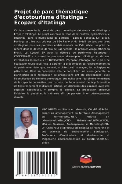 Ce livre présente le projet de parc thématique d'écotourisme d'Itatinga - Ecoparc d'Itatinga. Le projet concerne la zone de la centrale hydroélectrique d'Itatinga, dans la municipalité de Bertioga - Baixada Santista, SP, Brésil. Bertioga est liée aux origines de São Paulo et du Brésil, en tant que point stratégique pour les premiers établissements au XVIe siècle, un point de repère dans la défense de Vila de São Vicente - le premier village officiel du Brésil. Le Conseil SP pour la défense du patrimoine historique - CONDEPHAAT - a ouvert le processus d'inscription d'Itatinga et de ses installations (processus n° 40036/2000). L'écoparc d'Itatinga, par le biais de l'utilisation touristique, vise à garantir la préservation de l'environnement et du patrimoine historique, culturel, architectural, paysager, technologique et pittoresque. Dans sa conception, afin de consolider une vision générale, la planification et la formulation de propositions ont été développées, avec l'identification du contenu thématique, des utilisations, du dimensionnement de la capacité de soutien, des risques, de l'équipement, de la préservation de l'environnement et d'autres actions, en délimitant des espaces avec des objectifs spécifiques, y compris la gestion. La proposition préserve l'histoire, le passé et la mémoire afin de parvenir à un développement durable.