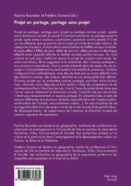 L'ouvrage porte sur la dimension sociale du projet de territoire, la participation des habitants et des usagers et les effets du projet sur le partage de l'espace. Au travers d'exemples pris au nord comme au sud, sont abordés les enjeux de mixité sociale, de gentrification, de dé-paupérisation ou de préservation de l'entre-soi.