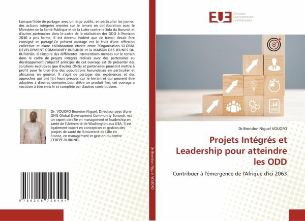 Lorsque l'idée de partager avec un large public, en particulier les jeunes, des actions intégrées menées sur le terrain en collaboration avec le Ministère de la Santé Publique et de la Lutte contre le Sida du Burundi et d'autres partenaires dans le cadre de la réalisation des ODD à l'horizon 2030 a pris forme, il est devenu évident que ce travail devait être consigné et partagé.Ce présent ouvrage est le fruit d'une réflexion collective et d'une collaboration étroite entre l'Organisation GLOBAL DEVELOPMENT COMMUNITY BURUNDI et la MAISON DES JEUNES DU BURUNDI. Il s'inspire des différentes interventions menées sur le terrain dans le cadre de projets intégrés réalisés avec des partenaires au développement.L'objectif principal de cet ouvrage est de présenter des solutions évolutives que d'autres ONGs et partenaires pourront mettre à profit pour le bien-être des populations burundaises en particulier et africaines en général. Il s'agit de partager des expériences et des approches qui ont fait leurs preuves sur le terrain et qui peuvent être adaptées à d'autres contextes.Loin d'être un produit fini, cet ouvrage a vocation à être enrichi et complété par d'autres contributions.