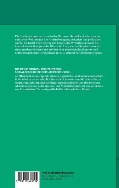 Von der international boomenden Forschung zu Weltliteratur bisher weitestgehend unbeachtet entstand zur Zeit der Weimarer Republik eine internationalistische Weltliteratur der Arbeiterbewegung. Diese stellt den historisch ersten Versuch dar, eine Weltliteratur als Teil einer politischen Massenbewegung zu erzeugen. Auf der Basis der Analyse von u.a. Zeitschriften, Buchgemeinschaften und Autoren wie Franz Jung, Anna Seghers und Egon Erwin Kisch zeichnet die Studie literatur-, kultur- und mediengeschichtliche Aspekte der Vorstellungen, Theorien und Praktiken dieser Form der Weltliteratur nach. Insbesondere beschäftigt sie sich mit transnationalen literarischen Gegenöffentlichkeiten sowie mit einem literarischen Wissen vom globalen Proletariat und alternativen Vorstellungen von Globalisierung, die in den untersuchten Texten erzeugt werden. Die Studie leistet einen Beitrag zur Theorie der Weltliteratur, stärkt die intersektionale Kategorie der Klasse für Analysen von Repräsentationen einer geteilten Moderne und eröffnet neue poetologische, literatur- und kulturgeschichtliche Perspektiven auf die Literatur der Arbeiterbewegung.
