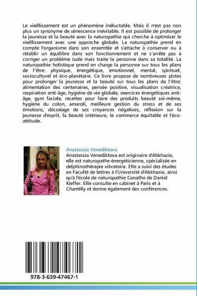 Le vieillissement est un phénomène inéluctable. Mais il n'est pas non plus un synonyme de sénescence inévitable. Il est possible de prolonger la jeunesse et la beauté avec la naturopathie qui cherche à optimiser le vieillissement avec une approche globale. La naturopathie prend en compte l'organisme dans son ensemble et s'attache à conserver ou à rétablir un équilibre dans son fonctionnement et ne s arrête pas à corriger un problème isolé mais traite la personne dans sa totalité. La naturopathie holistique prend en charge la personne sur tous les plans de l être: physique, énergétique, émotionnel, mental, spirituel, socioculturel et éco-planétaire. Ce livre propose de nombreuses pistes pour prolonger la jeunesse et la beauté sur tous les plans de l être: alimentation des centenaires, pensée positive, visualisation créatrice, respiration anti-âge, hygiène de vie globale, exercices énergétiques anti-âge, gym faciale, recettes pour faire des produits beauté soi-même, hygiène du colon, amaroli, meilleure gestion du stress et de ses émotions, décodage de ses croyances négatives, réflexion sur la jeunesse d'esprit, la beauté intérieure, le commerce équitable et l'éco-attitude.
