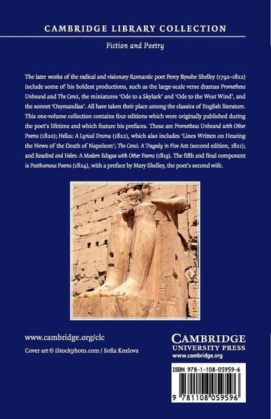 The later works of the radical and visionary Romantic poet Percy Bysshe Shelley (1792-1822) include some of his boldest productions, such as the large-scale verse dramas Prometheus Unbound and The Cenci, the miniatures 'Ode to a Skylark' and 'Ode to the West Wind', and the sonnet 'Ozymandias'. All have taken their place among the classics of English literature. This one-volume collection contains four editions which were originally published during the poet's lifetime and which feature his prefaces. These are Prometheus Unbound with Other Poems (1820); Hellas: A Lyrical Drama (1822), which also includes 'Lines Written on Hearing the News of the Death of Napoleon'; The Cenci: A Tragedy in Five Acts (second edition, 1821); and Rosalind and Helen: A Modern Eclogue with Other Poems (1819). The fifth and final component is Posthumous Poems (1824), with a preface by Mary Shelley, the poet's second wife.