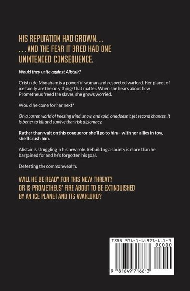 His reputation had grown... ...and the fear it bred had one unintended consequence. Cristin de Monaham is a powerful and respected warlord. Her family and the planet of ice she rules are all that matters. When she hears about how Prometheus freed the slaves, she grows worried. Would he come for her next? On a barren world of freezing wind and snow, one doesn't get second chances. It is better to kill and survive than risk diplomacy. Rather than wait on this conqueror, she'll go to him-with her allies in tow, she'll crush him. Alistair is struggling in his new role. Rebuilding a society is more than he bargained for and he's forgotten his goal. Defeating the Commonwealth. Will he be ready for this new threat? Or is Prometheus' fire about to be extinguished by an ice planet and its warlord? You'll love this fifth book in The Great Insurrection series, because not everything is black and white. Everyone has something to protect. Grab it now.