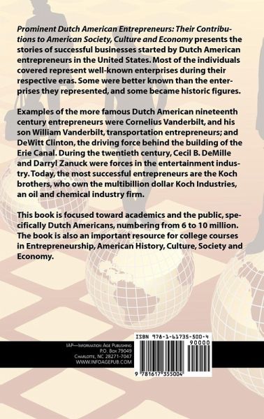 The book presents the stories of the more successful Dutch American entrepreneurs, active in the United States, with some going back as far as 400 years. The majority of the entrepreneurs covered in the book were active during the past 150 years. Each of the individuals covered represent an enterprise that was well known during its respective era. In some of the cases the individuals were better known than the enterprises they represented, and some became historic figures. Some of the more famous Dutch American entrepreneurs are Cornelius Vanderbilt, and his son William Vanderbilt, transportation entrepreneurs in the nineteenth century. Also famous during the early nineteenth century was DeWitt Clinton, the driving force behind the building of the Erie Canal. During the twentieth century, there were such famous Dutch American entrepreneurs as Cecil B. DeMille, Darryl Zanuck, and others in the entertainment industry. The most successful entrepreneurs, still alive today, are the billionaire businessmen, the Koch brothers, who own the multibillion dollar Koch Industries, an oil and chemical industry firm. The book's audience consists of academics, the public, and specifically the Dutch American public, numbering from 6 to 10 million people. The book is also an important source book and reader for college courses in Entrepreneurship, American History, Culture, Society and Economy.